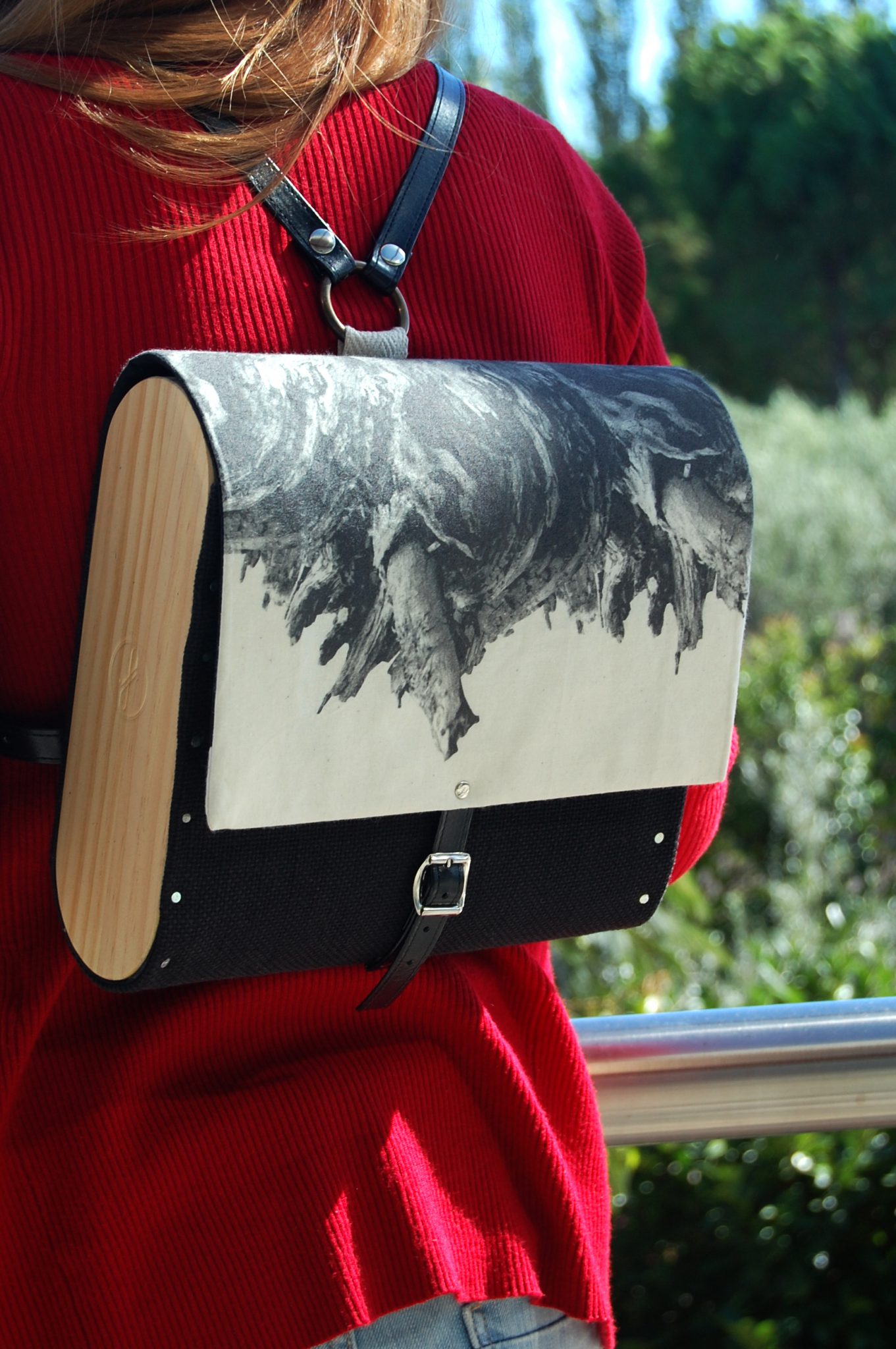 La colección exclusiva y que se puede pedir por encargo, consta de cuatro modelos. Dos bolsos bandolera, con laterales en madera de forma redonda y otras dos mochilas con laterales en madera pero con forma de rectángulo de cantos redondeados. Cómodos y funcionales, tanto la mochila como el bolso tiene bastante capacidad para poder llevar todo lo necesario para un día fuera de casa.