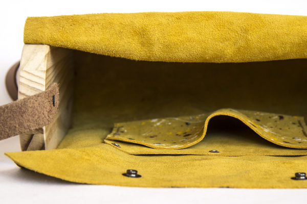 -Bolsito para tus eventos, en piel de vacuno, laterales en madera de pino.