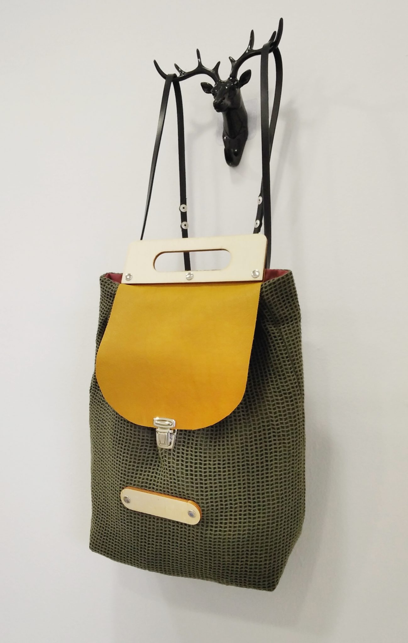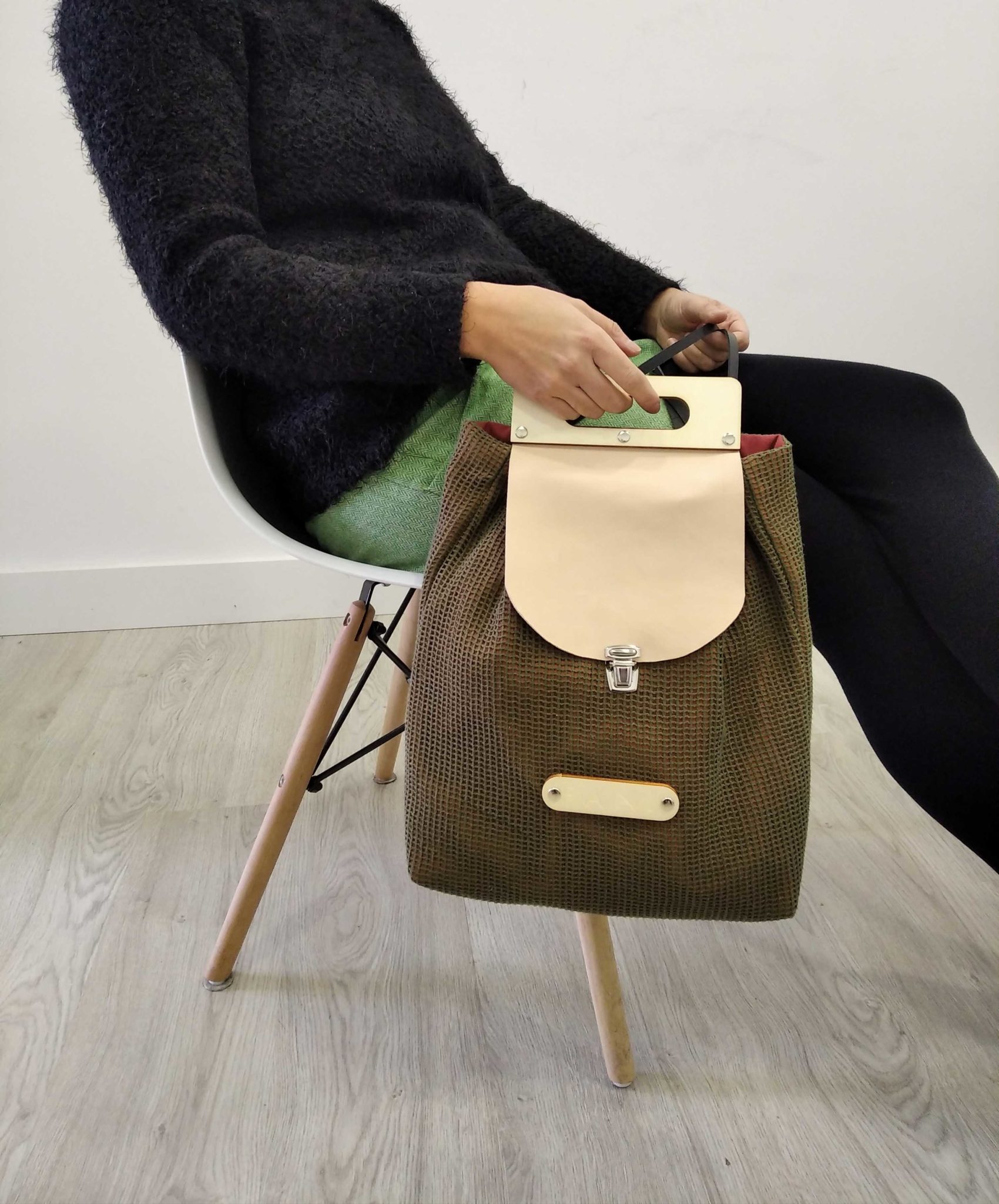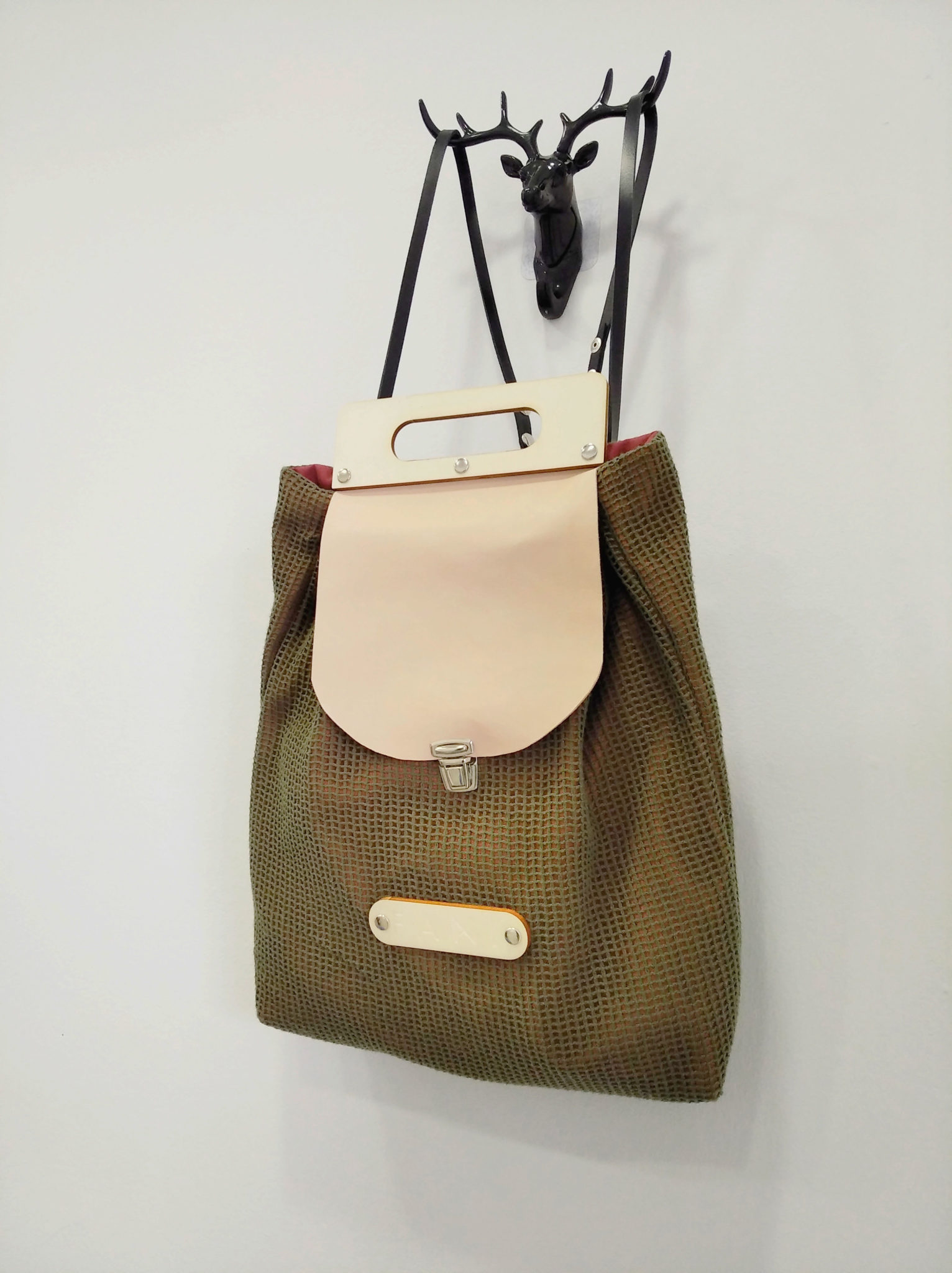 Mochila hecha de tela de red de algodón con tela de lona y solapa en piel de vacuno.